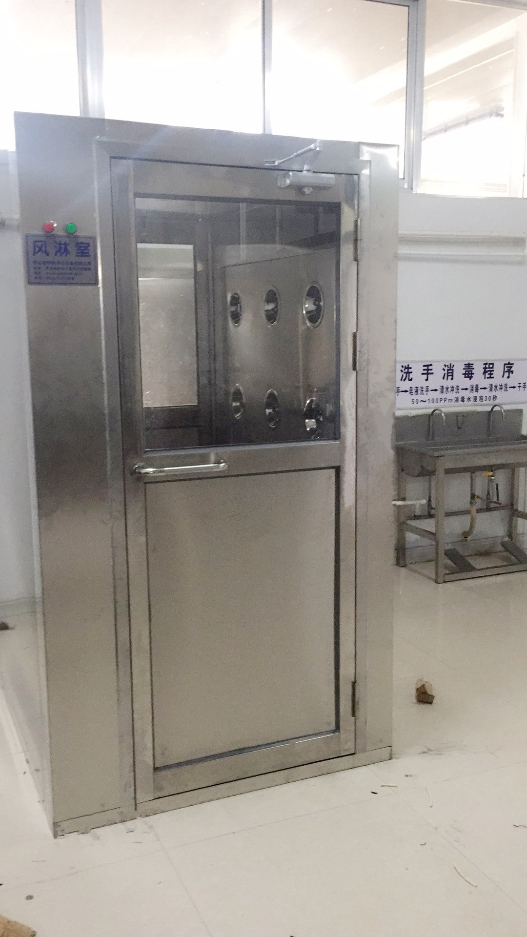4、自動化控制,單人單吹風(fēng)淋室系統(tǒng)采用PLC智能化的控制手段,控制面板上LED顯示屏可正確顯示風(fēng)淋的運行狀態(tài)、雙門的互鎖狀態(tài)、風(fēng)淋周期進度和延時開門狀態(tài)。并設(shè)有光電感應(yīng)器,單向通道風(fēng)淋室,從非潔凈區(qū)進入,關(guān)門后紅外線感應(yīng)到人就吹淋,吹淋后入門鎖閉,只能從出門走出風(fēng)淋室。
