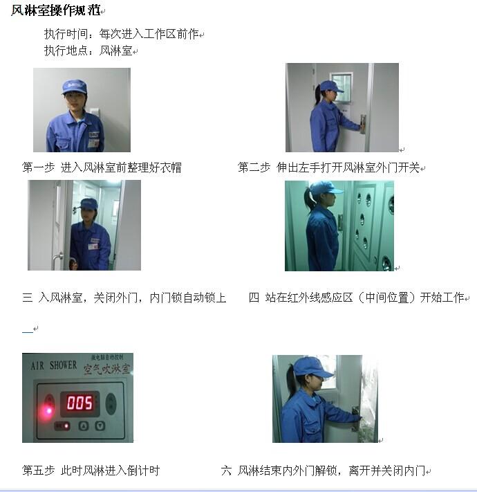 依風(fēng)淋室作業(yè)標(biāo)準(zhǔn)書進(jìn)行正確使用,避免違規(guī)操作,如:不能隨意更改風(fēng)淋室設(shè)定的各項(xiàng)參數(shù);在正常工作模式下,切勿強(qiáng)迫開關(guān)風(fēng)淋門,不能觸動(dòng)任何控制開關(guān);風(fēng)淋前后,輕開輕關(guān)風(fēng)淋門;發(fā)生故障時(shí),不要慌,最好不要啟動(dòng)手動(dòng)按鈕,請(qǐng)及時(shí)通知專業(yè)人員來處理。